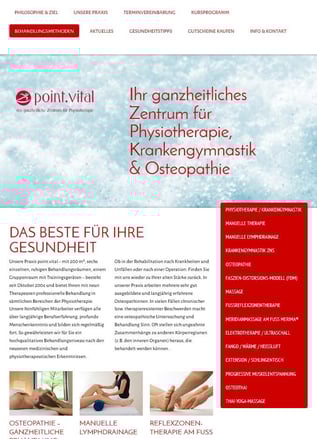 Die Praxis point.vital besteht seit Oktober 2004 und bietet ihren Kunden mit einem großen Therapeuten-Team professionelle Behandlung in sämtlichen Bereichen der Physiotherapie.